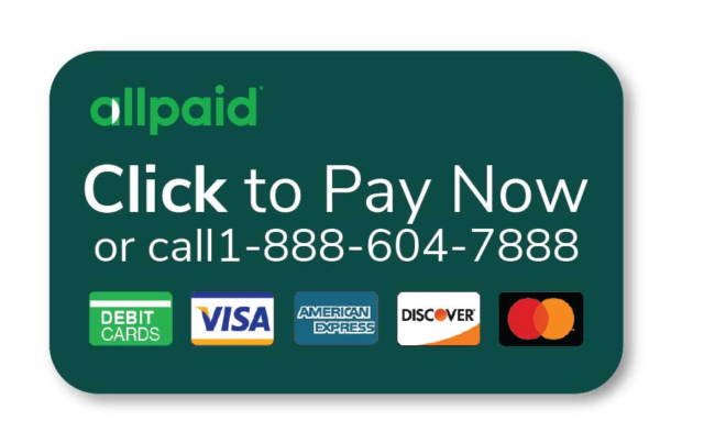 AllPaid accepts the major credit and debit card brands for payments 24 hours a day, 7 days a week on-site, online or by phone (1-888-604-7888). For added convenience, AllPaid has a fully staffed, bilingual call center available 24/7.